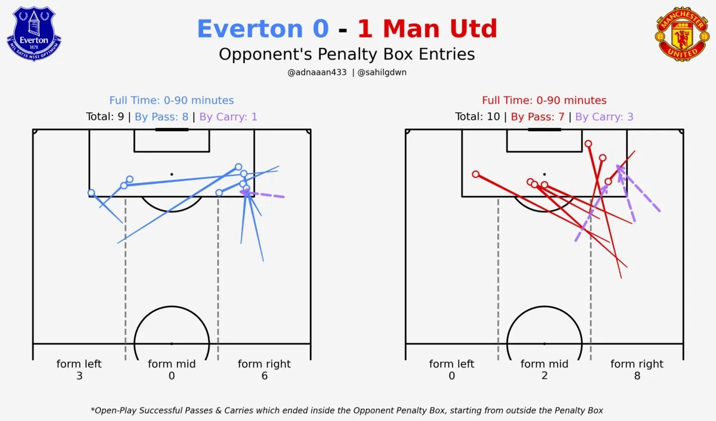Box entries tell the real story: United 10 (8 by pass, 2 by carry), Everton 9 — almost identical access. Both teams attacked overwhelmingly down the right channel.