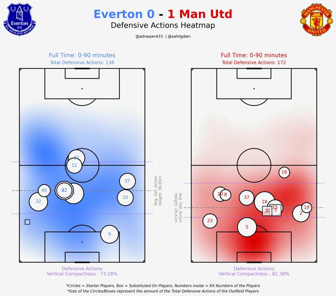 Vertical compactness measures how tightly compressed a team's defensive shape is from top to bottom (100% = perfectly compact). United's 82.4% vs Everton's 73.2% means United's defensive block stayed narrower and harder to play through — which is why 10 Everton corners and sustained second-half pressure produced 0 big chances.