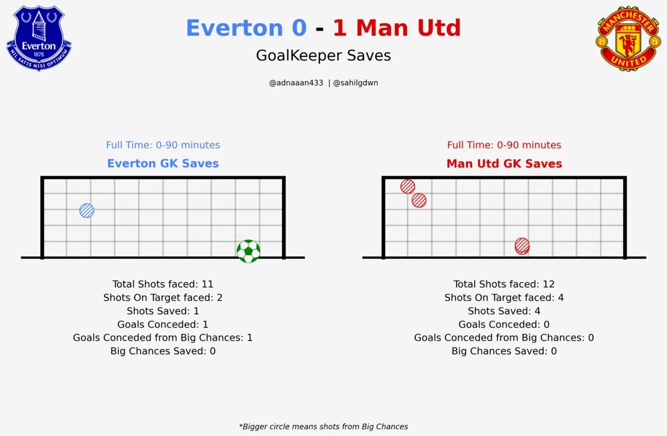 The most important number in the match. Both teams had identical box access, 16 touches each. Everton had more shots (12–11) and more corners (10–1). United had more big chances (2–0) and better xG per shot (0.12 vs 0.05).