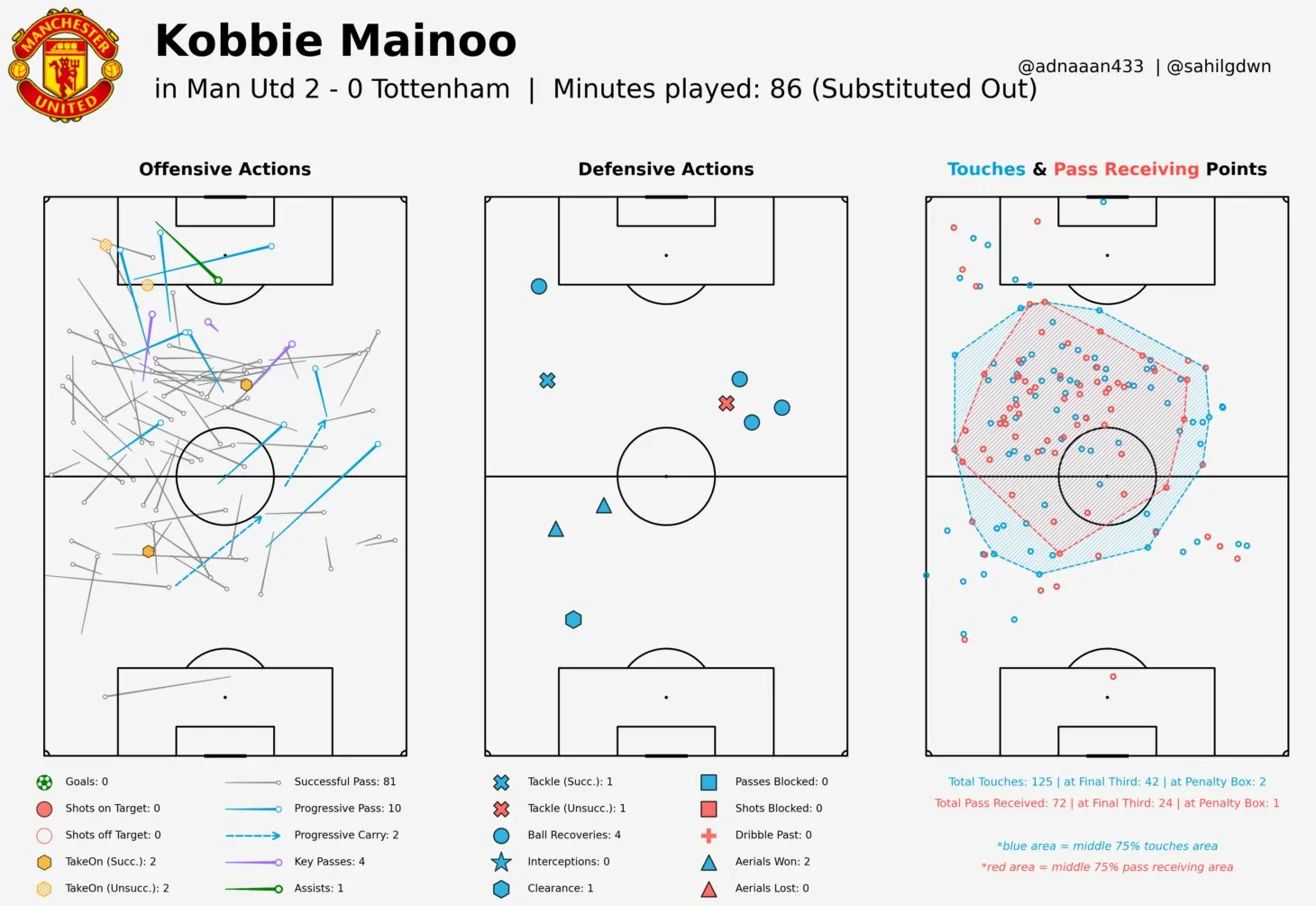 125 touches, 10 progressive passes, 4 key passes, 1 assist. High and wide touch clusters, the ball consistently moving forward. This is what Mainoo looks like when space opens up.