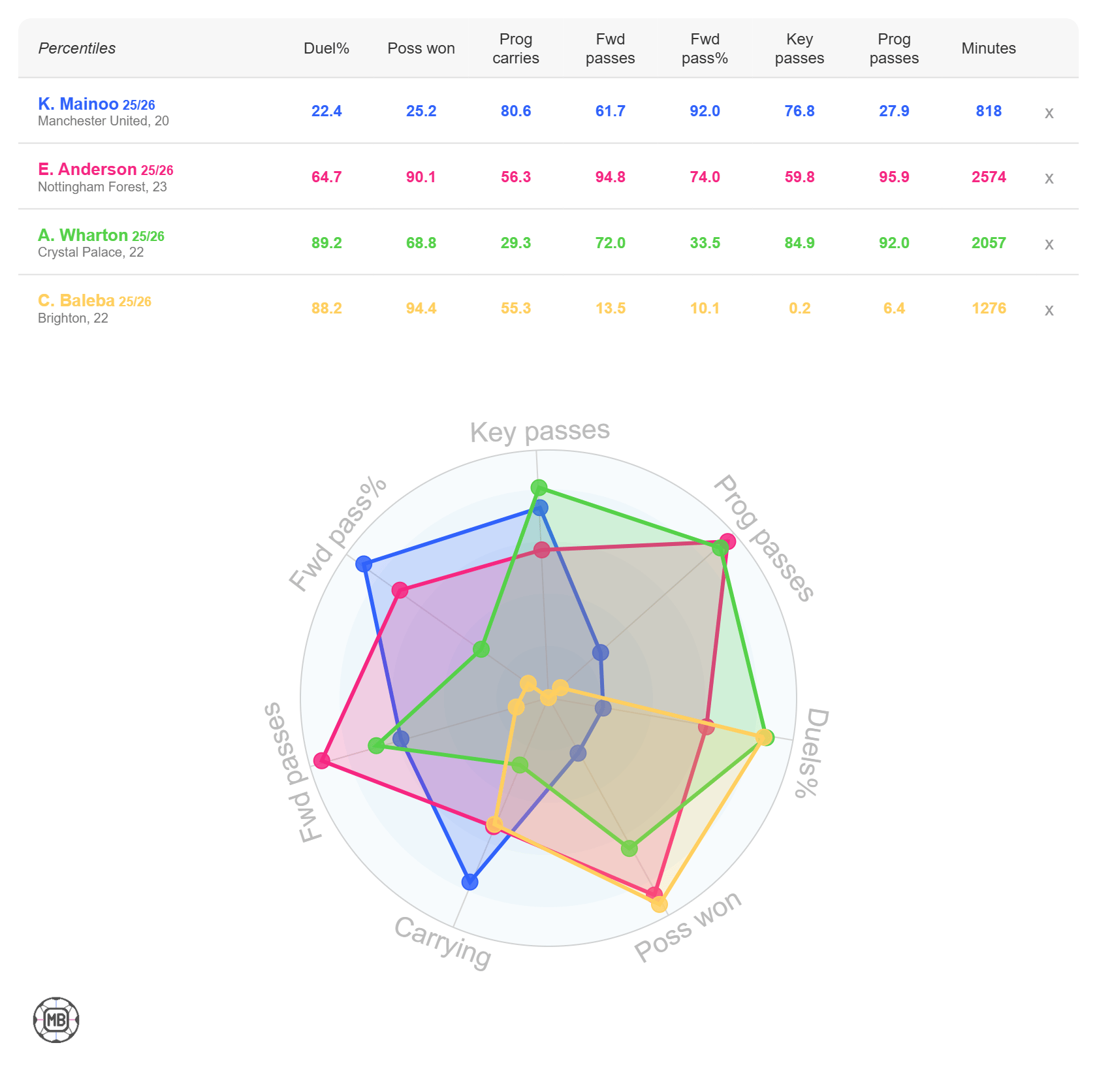 Looking at the four midfielders compared — Mainoo, Anderson, Wharton, and Baleba — the profiles are clearly distinct: