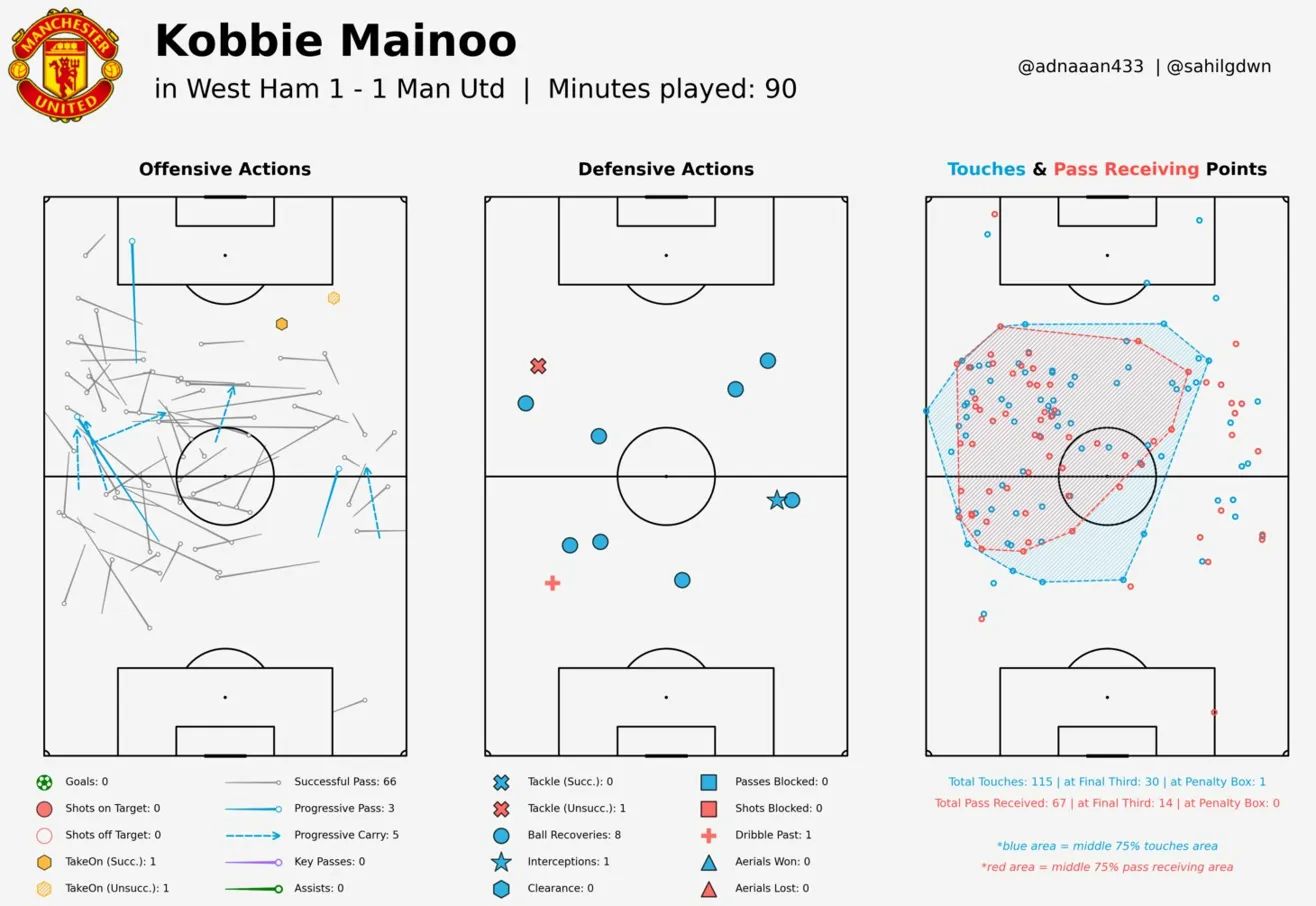 The 1-1 draw is the more instructive match. West Ham sat in a low block, compressed the space, and dared United to find a way through. Mainoo finished with 0 key passes, 0 assists, and while he was tidy in possession, he couldn't find the killer ball that breaks a deep defensive shape.