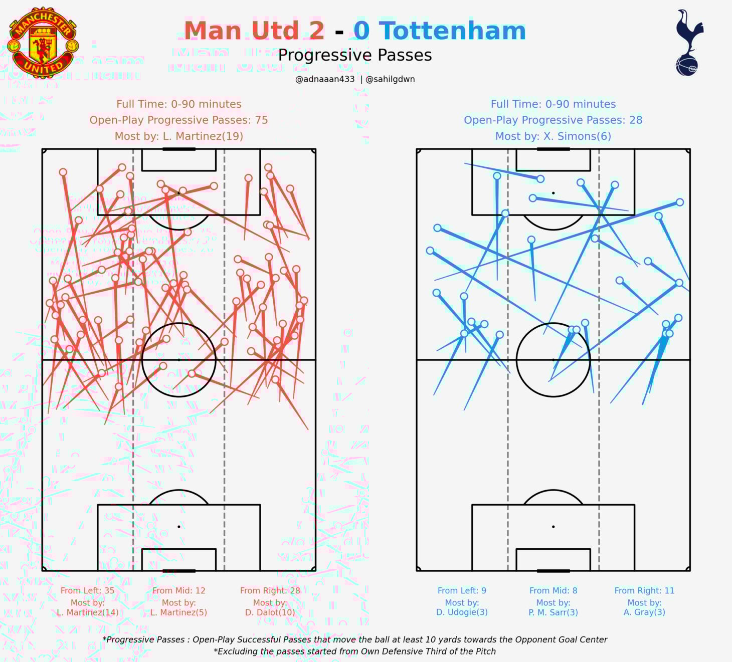 Open-play progressive passes: United 75, Spurs 28
