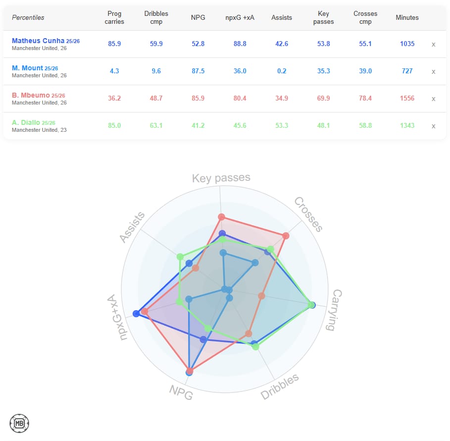 The Carrier (Amad Diallo): Elite at moving the ball upfield (85th percentile carries), but lower direct threat (45th percentile npxG+xA).