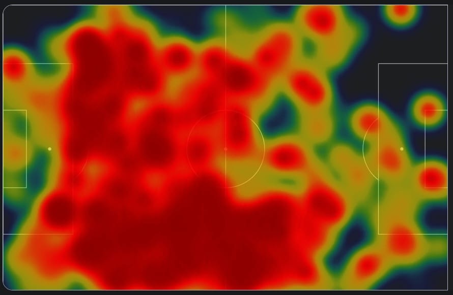 In Amorim’s 3-4-3, Cunha is normally the Left Attacking Midfielder (LAM). But the heatmap shows he’s operating almost everywhere on the pitch!
